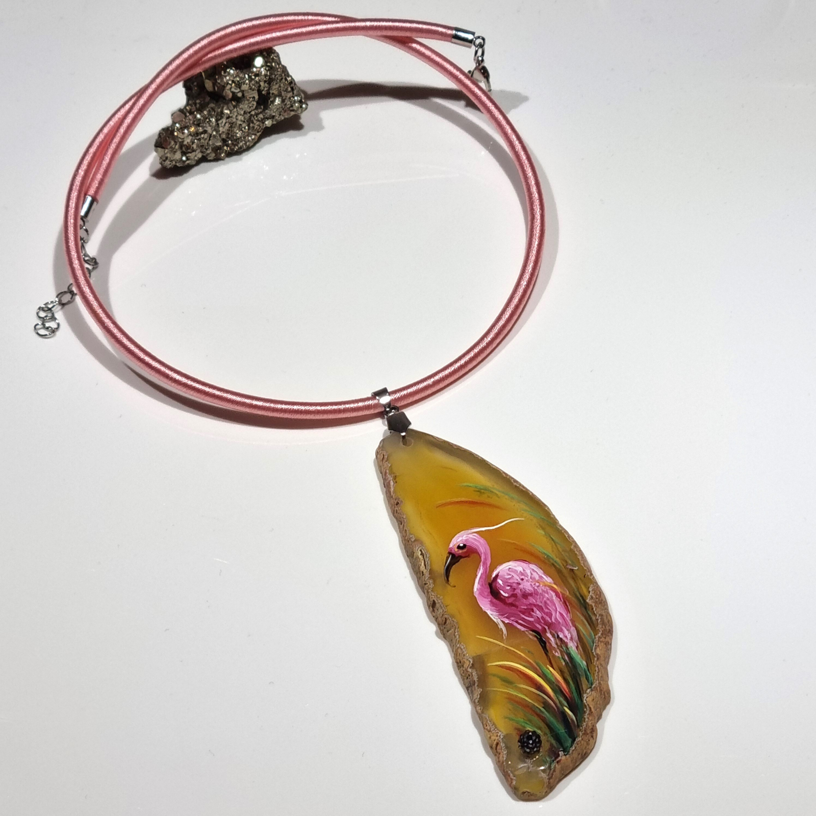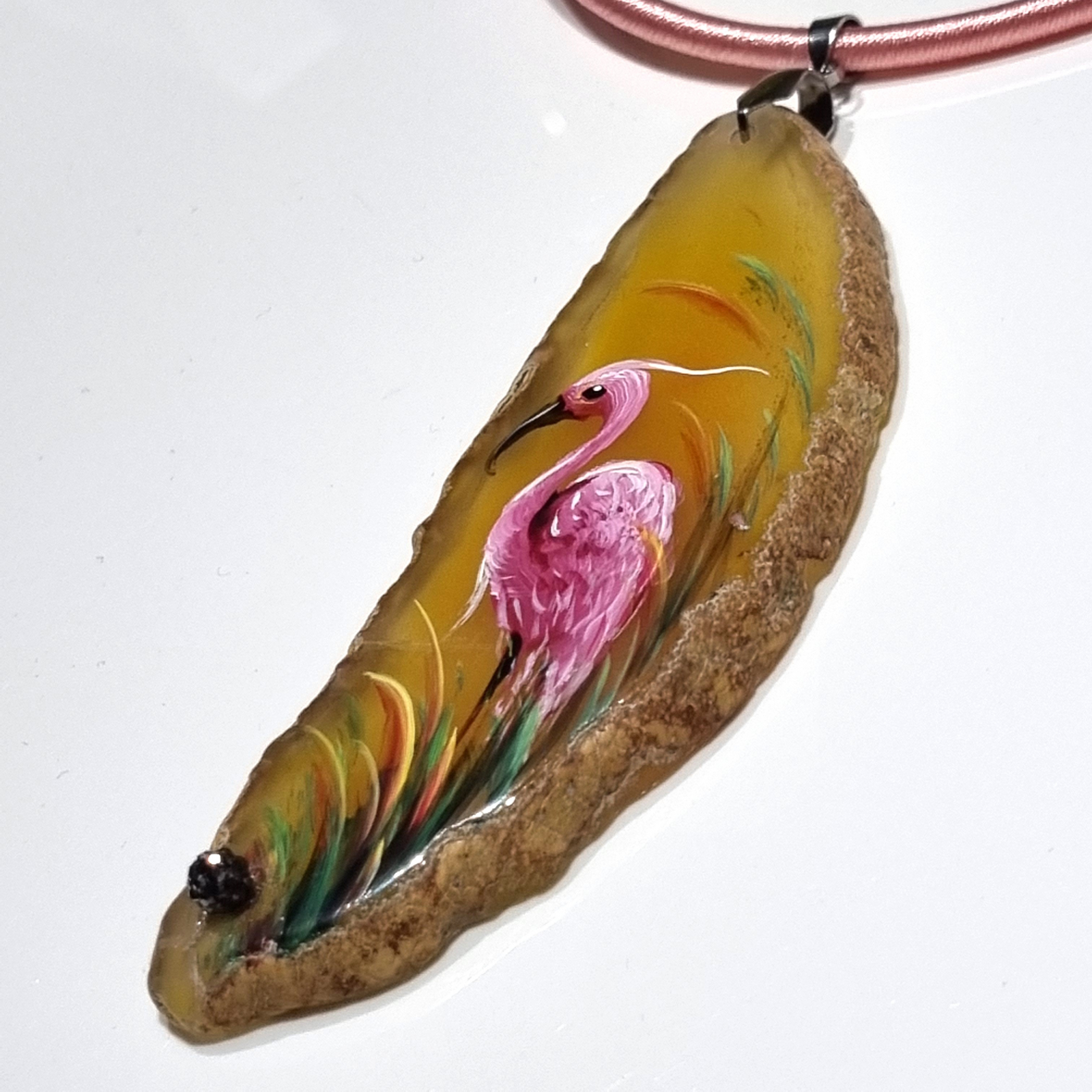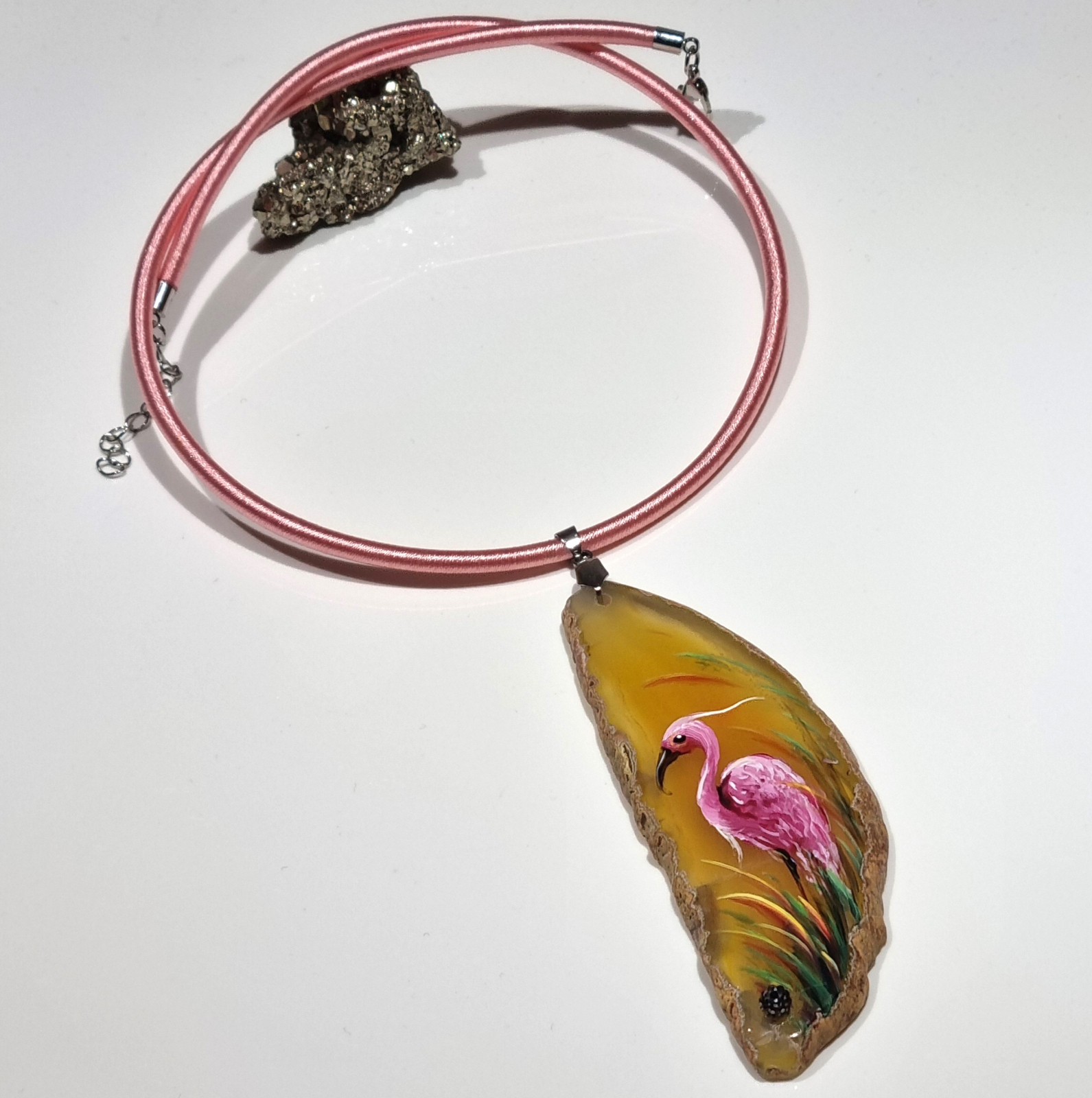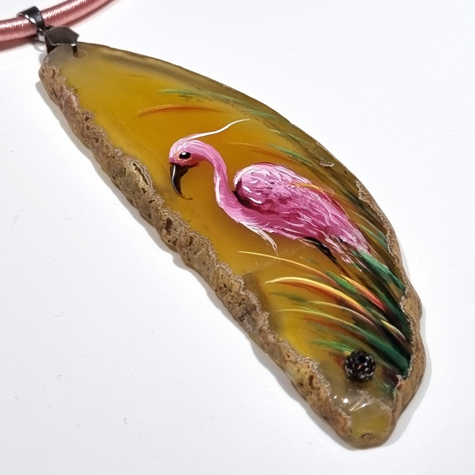 Colier cu pandantiv statement din agat pictat manual, decorat cu rhinestone, pe snur din silicon imbracat in matase