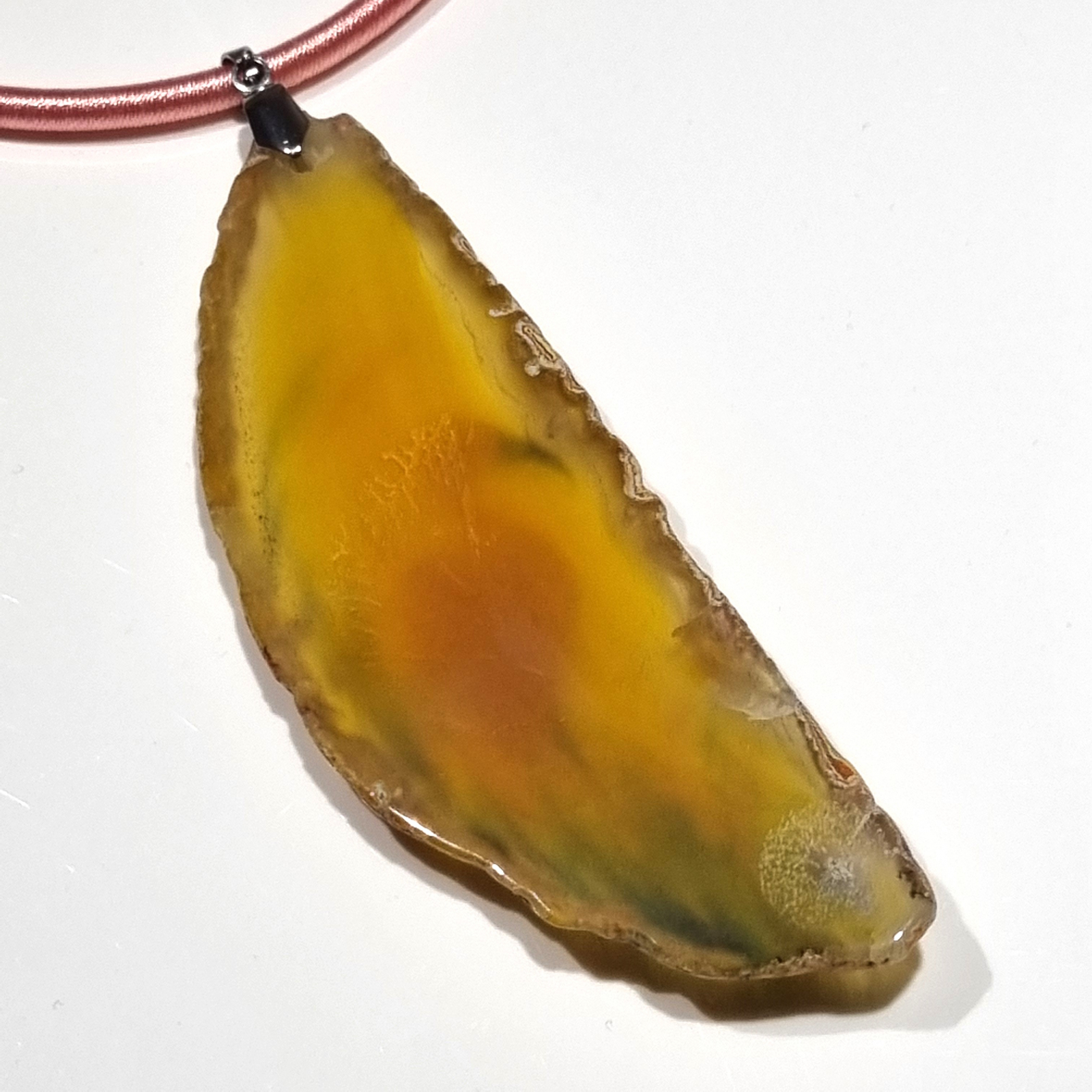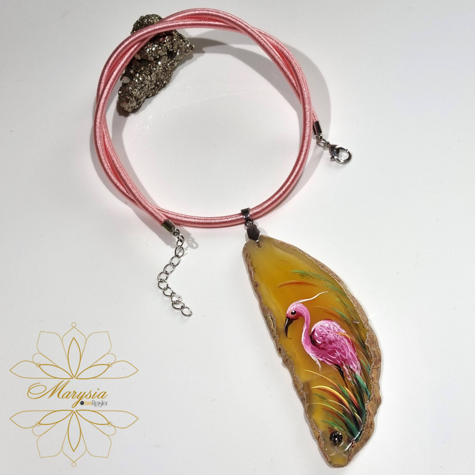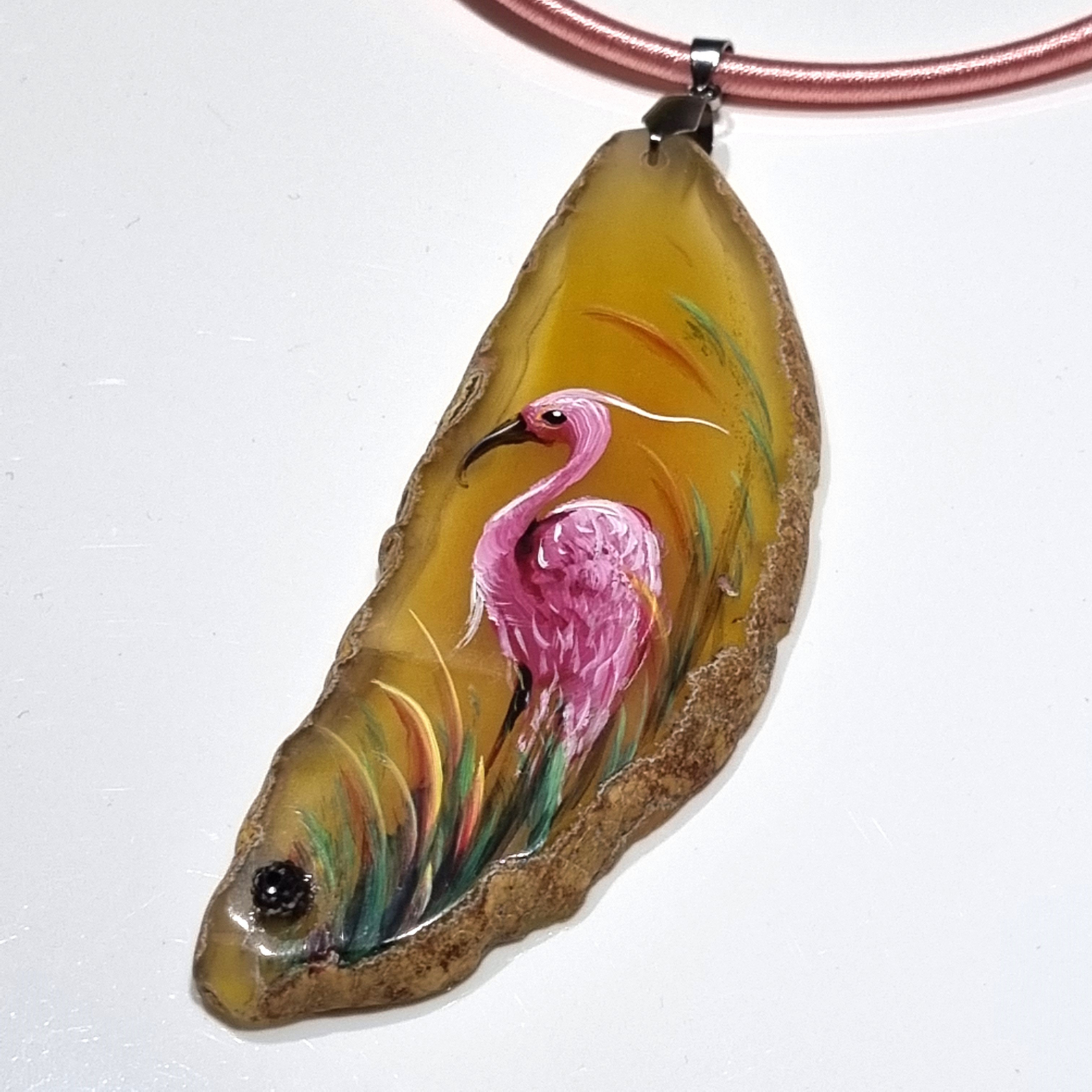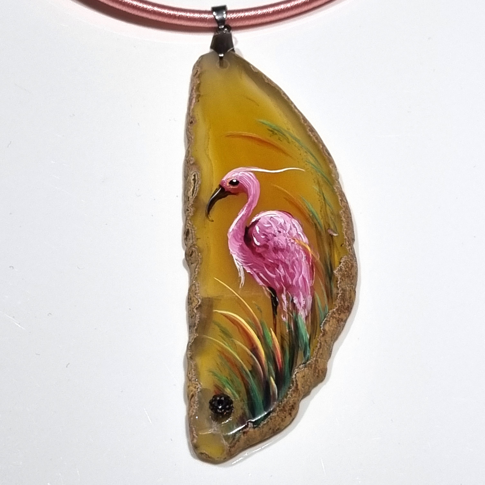 Colier cu pandantiv statement din agat pictat manual, decorat cu rhinestone, pe snur din silicon imbracat in matase