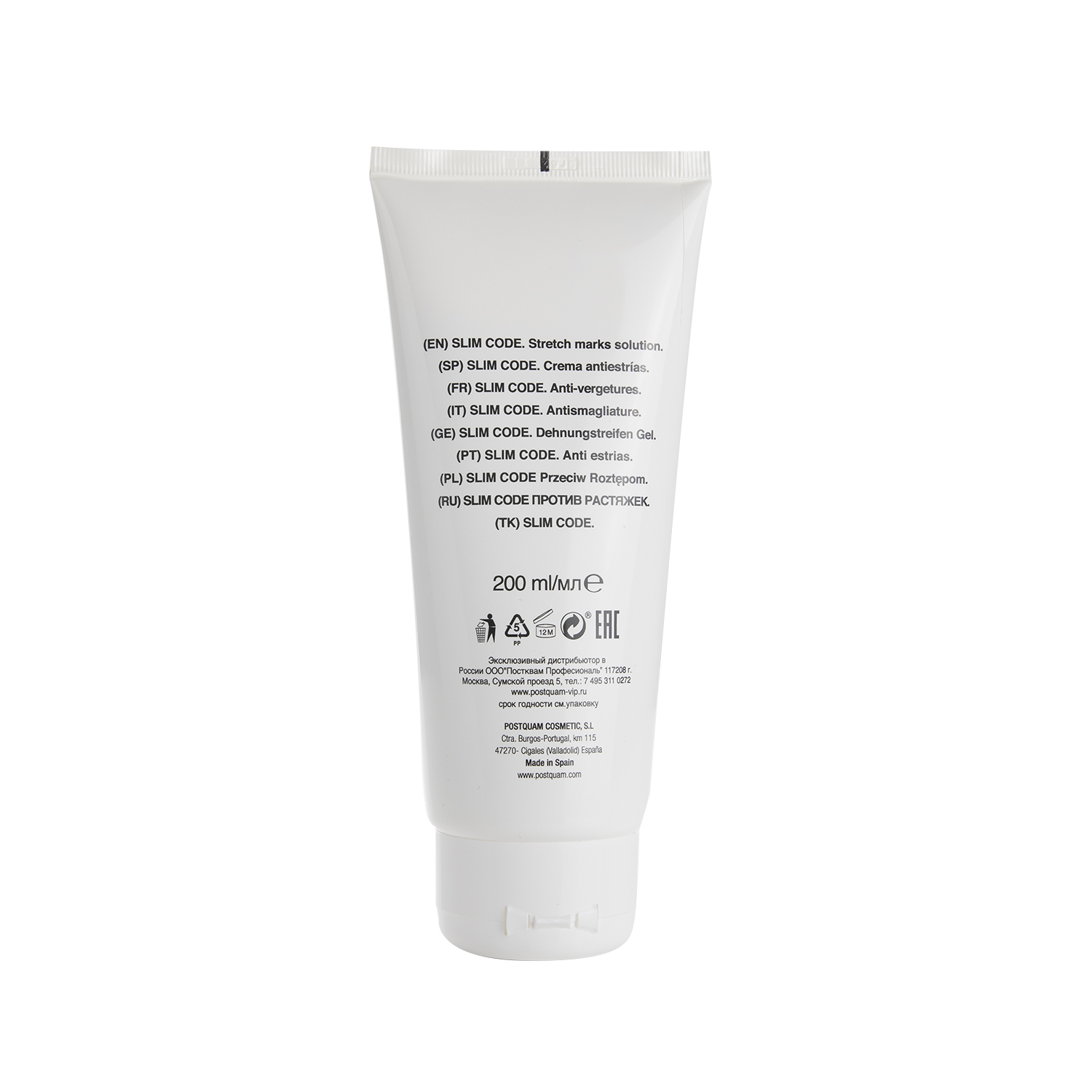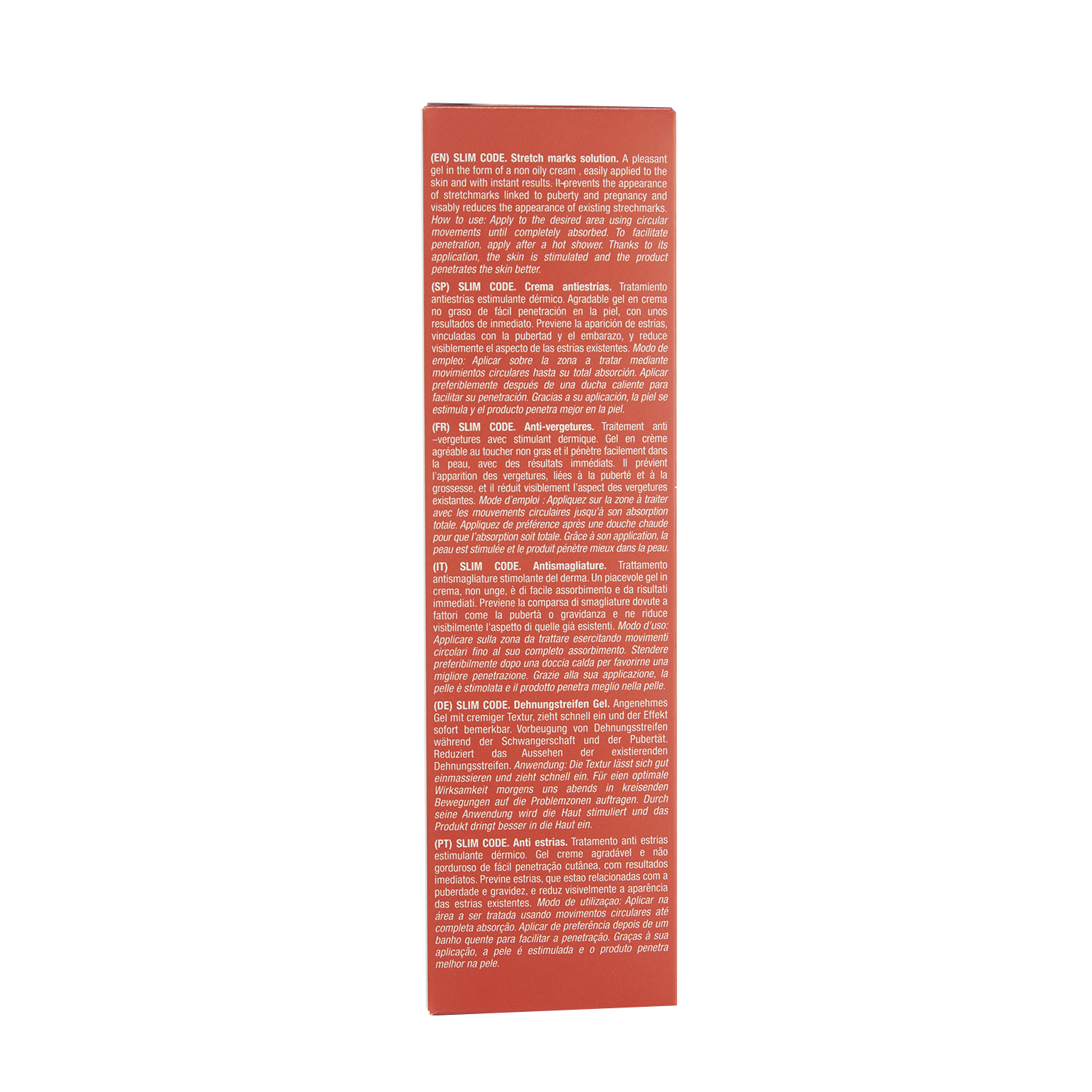 Крем против стрии, който стимулира възстановяването на увредената кожа. Има лека текстура, под формата на немазен гел, с лесно проникване в кожата и резултати, които се появяват веднага след първите нанасяния. Slim Code намалява съществуващите стрии, подобрява вида на кожата и предотвратява появата на нови стрии, свързани с пубертета, напълняването и бременността. Възстановява тонуса на кожата, чрез повишено снабдяване с колаген и чрез стимулиране на секрецията на колаген от тъканта.